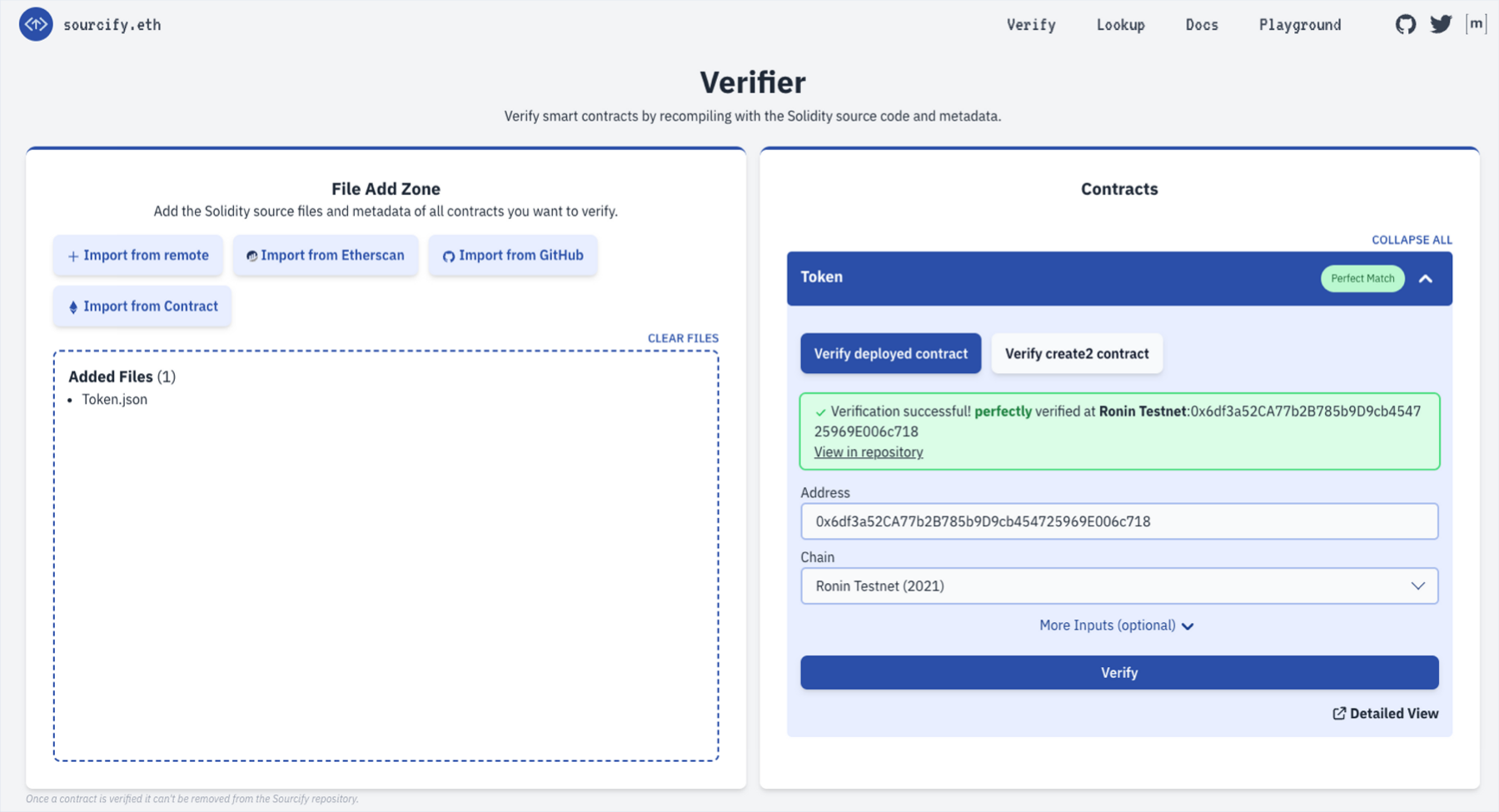 Verifying a smart contract is a crucial step to ensure the integrity and security of the Ronin network. The verification involves inspecting the contract's source code to ensure that it is bug-free, secure, and will perform as expected. We encourage the contract deployers to verify their contract by submitting the source code and metadata to our internal Sourcify service.