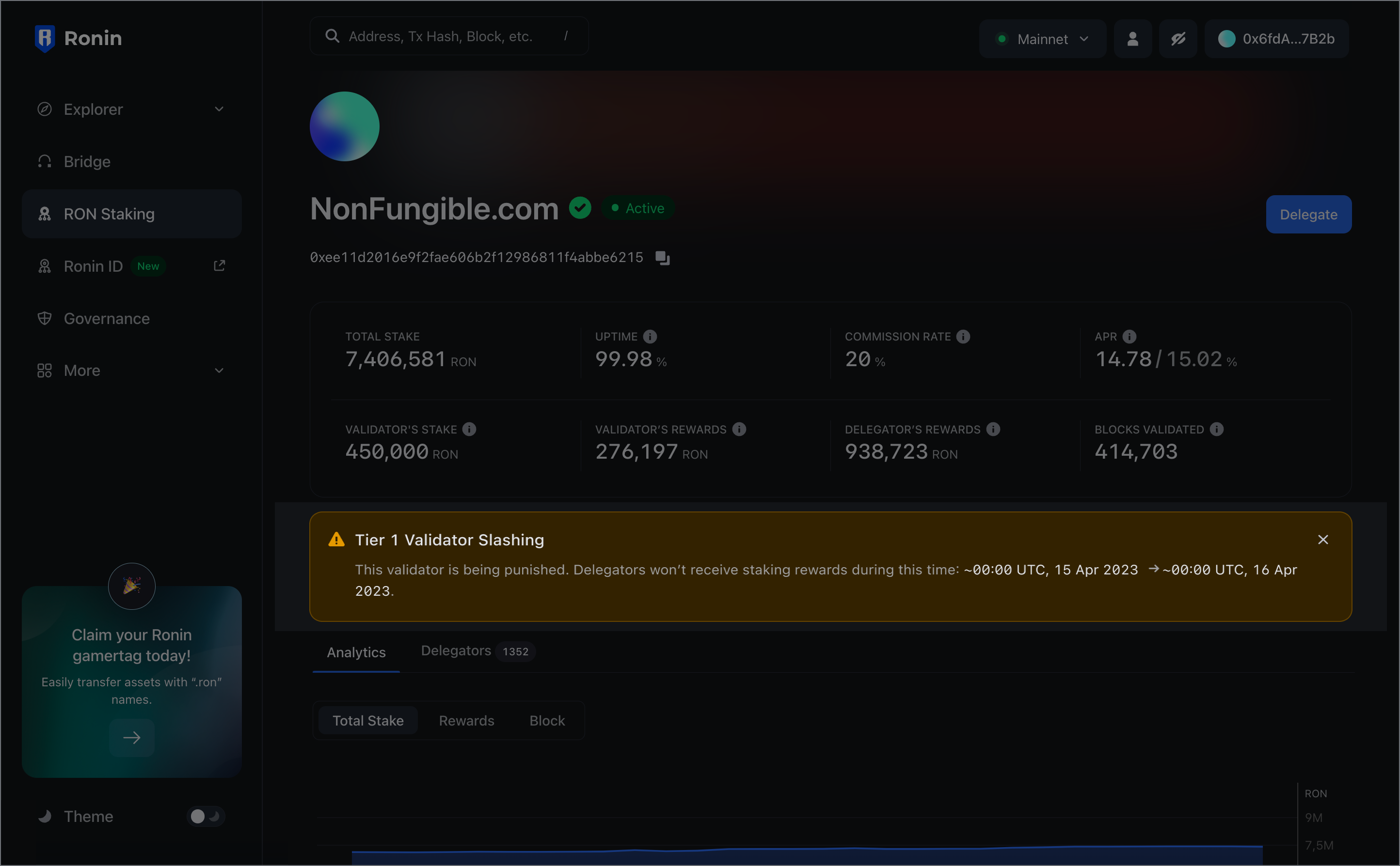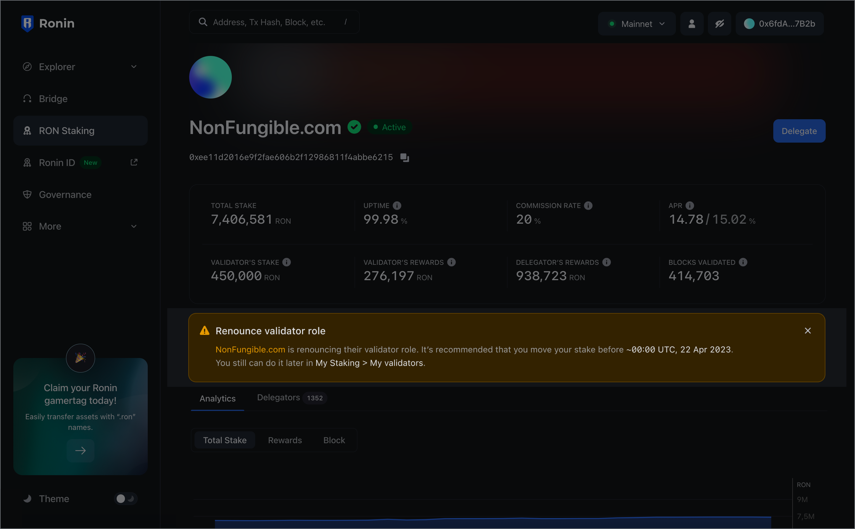 There are a few ways you can keep track of changes among your validators on the RON Staking page: