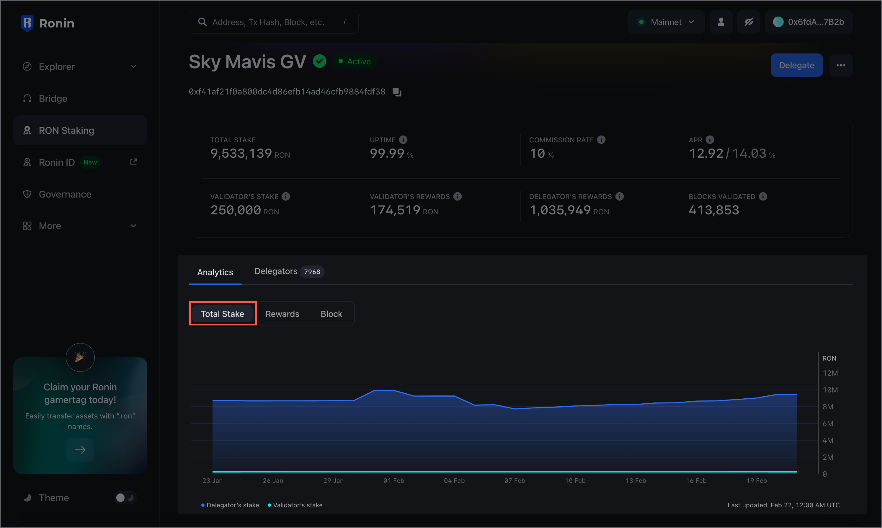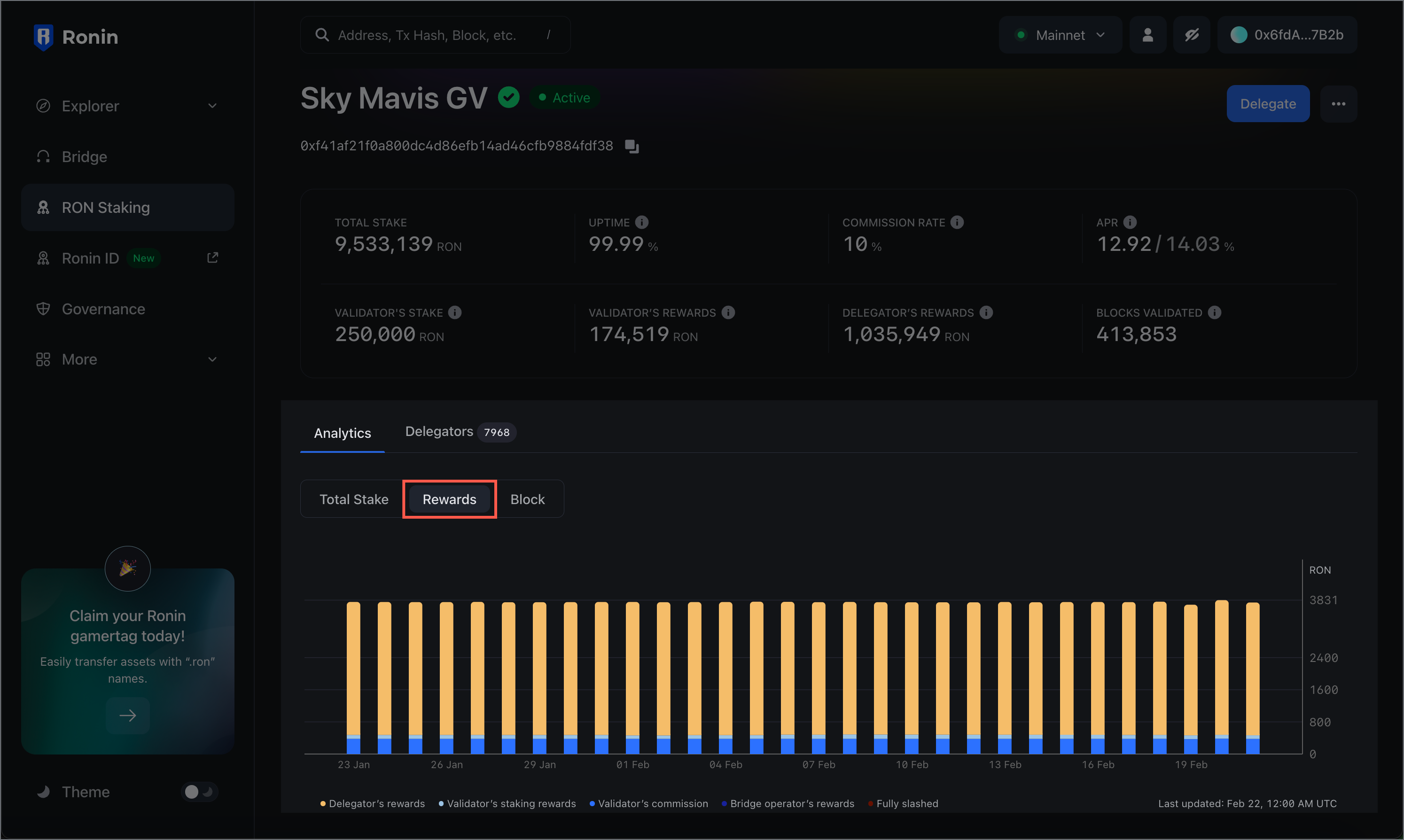 • You can also check the amount of delegators' rewards (both claimed and not claimed) for the last 30 days by selecting Analytics > Rewards.